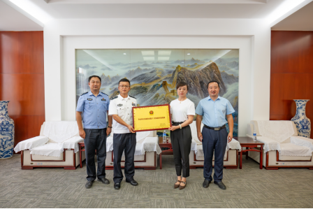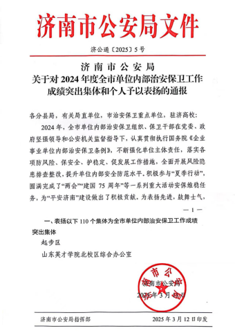 近期,济南市公安局印发了《关于对2024年度全市单位内部治安保卫工作成绩突出集体和个人予以表扬的通报》,我校北校区综合办公室荣获“2024年度全市单位内部治安保卫工作成绩突出集体”。2025年6月11日下午,起步区公安分局治安大队姚强大队长、吕良副大队长一行来我校亲授奖牌,学校执行校长王晓娜和北校区综合办公室主任高奎参加授牌仪式。