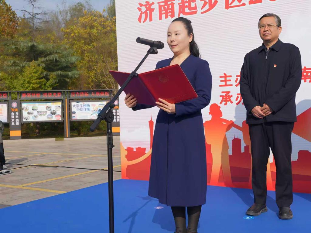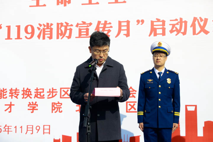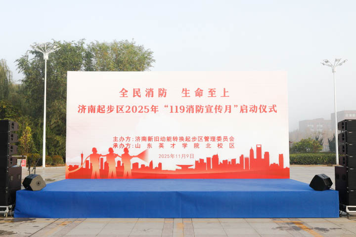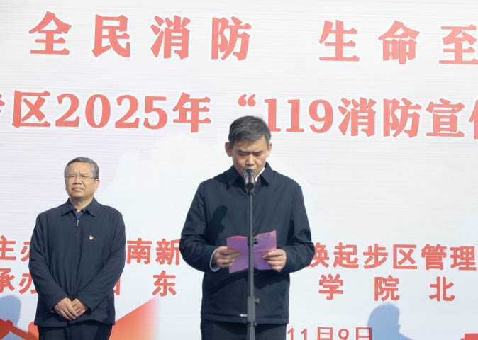 为进一步提高全民消防安全意识,积极营造浓厚的消防安全宣传氛围,11月9日济南起步区以”全民消防,生命至上——安全用火用电”为主题的2025年“119消防安全宣传月”启动仪式暨疏散逃生演练活动在我校举行。起步区综合执法部部长孟克非,社会治理部副部长王殿强,崔寨街道党工委副书记、街道办主任张博,消防救援大队长王永武,学校纪委书记、副校长李晓玲及各部门、二级学院负责人等1000余名师生代表参加此次活动。活动由起步区社会治理部李智魁副部长主持。
