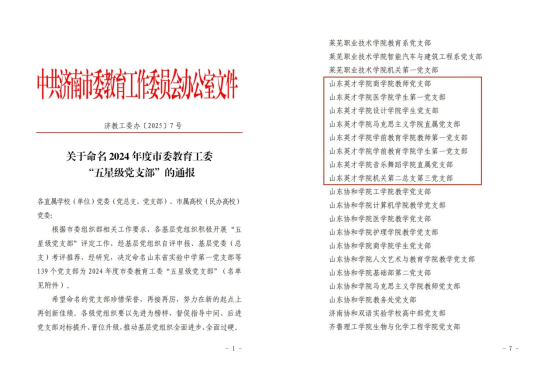 近日,济南市委教育工委印发《关于命名2024年度市委教育工委“五星级党支部”的通报》,我校商学院教师党支部、医学院学生第一党支部、设计学院学生党支部、马克思主义学院直属党支部、学前教育学院教师第一党支部、学前教育学院学生第一党支部、音乐舞蹈学院直属党支部、机关第二总支第三党支部被评为“五星级党支部”。