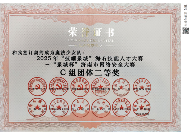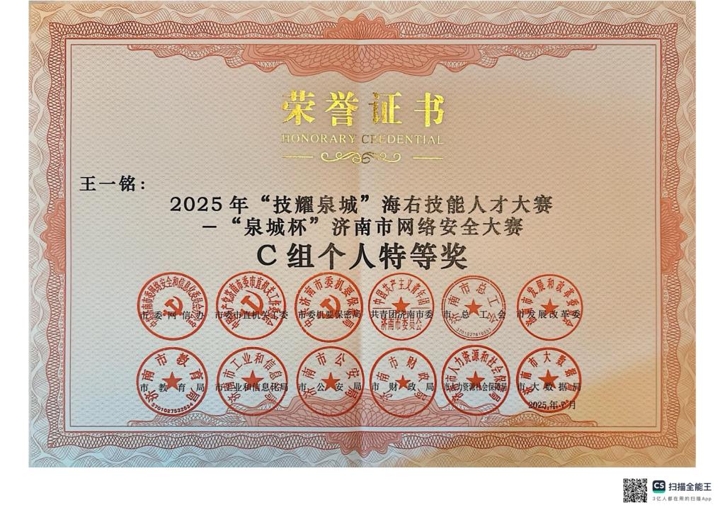 发布者: 时间:2025-07-17 浏览:7月15日,2025年“技耀泉城”海右技能人才大赛 ——“泉城杯”济南市网络安全大赛顺利举办。我校工学院学生代表队在此次大赛中表现卓越,一路过关斩将,荣获C组团体二等奖,王一铭同学夺得C组个人特等奖,学校同时获得优秀组织奖。