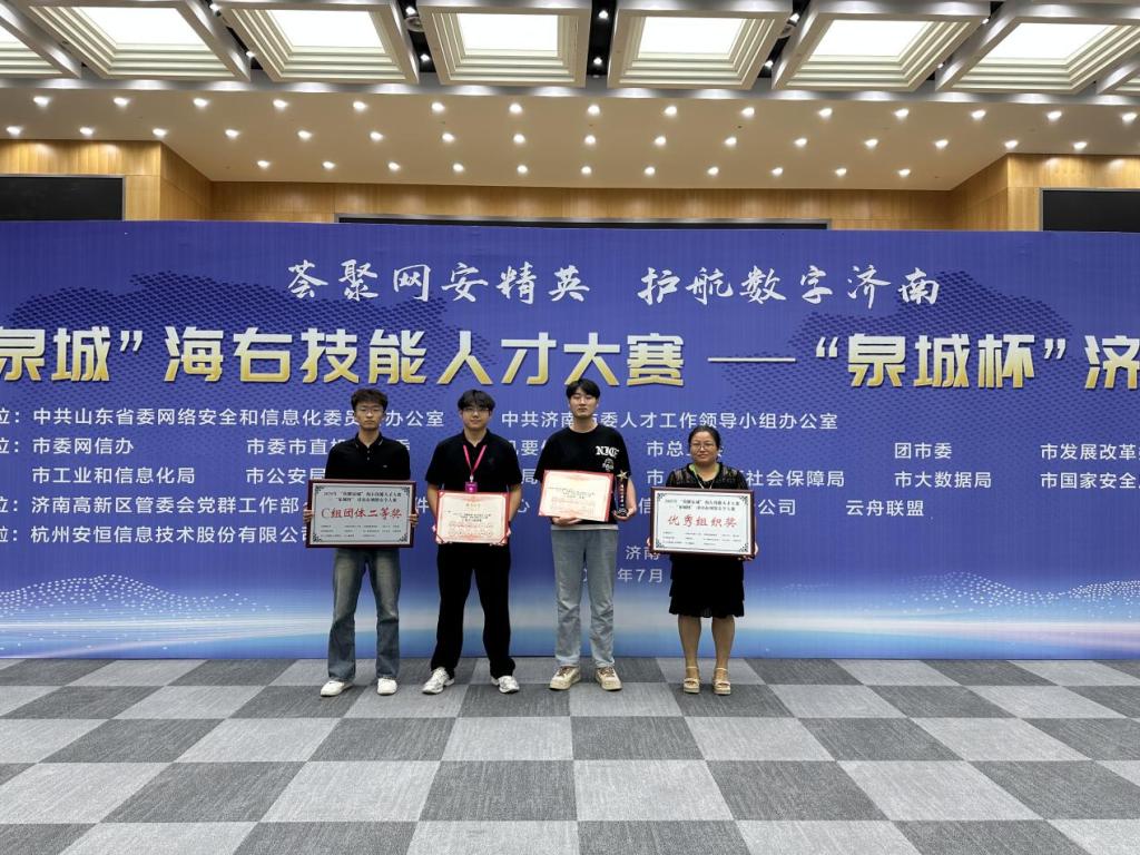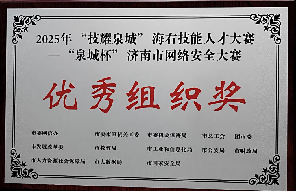 本次大赛由市委网信办、市委市直机关工委、市委机要保密局、市总工会、团市委、市发展改革委、市教育局、市工业和信息化局、市公安局、市财政局、市人力资源社会保障局、市大数据局、市国家安全局多部门联合主办。以“荟聚网安精英、护航数字济南”为主题,设置A、B、C三个组别,通过网络安全知识竞赛与解题夺旗赛(CTF)相结合的形式,综合考评参赛队伍的技能水平。我校工学院选派王一铭、张家豪、黄佳豪 3 名学生组成代表队,参与 C 组(高校学生组)竞赛。竞赛过程中,团队成员依托扎实的专业知识与高效的团队协作,成功攻克多项技术难题,最终荣获团体二等奖。王一铭同学在个人赛中展现出突出的专业素养,以优异表现摘得 C 组个人特等奖。我校因组织工作成效显著,获大赛组委会肯定,授予优秀组织奖。