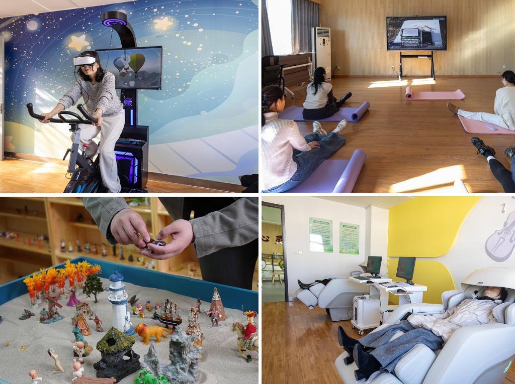 讲座结束后,教师们进入沉浸式沙龙体验环节。沙龙活动设置了“音乐按摩椅”“沙盘游戏”“正念瑜伽”“曼陀罗绘画”及“心灵观影”等五大主题模块,依托专业设施与指导教师,营造出安全、支持、开放的体验环境。活动现场氛围温馨而专注,教师们或沉浸于舒缓的音乐与按摩,或通过沙盘探索内心世界,或在正念瑜伽中感受呼吸与身体的联结,或借助曼陀罗彩绘表达情绪,或在观影中触发自我觉察与情感共鸣。在音乐疗愈、艺术表达、正念运动与影像对话等多种形式中,深入探索内心世界,有效释放身心压力。