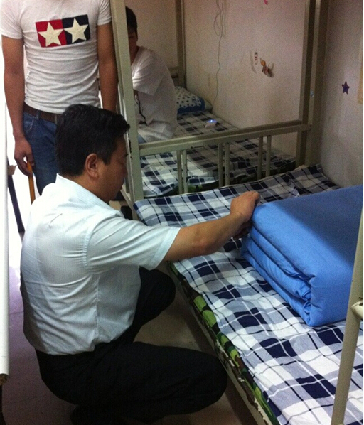 孙院长,王书记在各位辅导员的陪同下进到新生宿舍去检查、督促。军人出身的孙院长更是贴心的弯下腰来为学生们做军被示范,大家专心致志的关注、细心的观察,自己也都迫不及待的要体验一下,同学们也都做的很用心,不过十年磨一剑、冰冻三尺非一日之寒,想练就豆腐块必须有持之以恒的心,每天努力一点点,量变引起质变的决心。