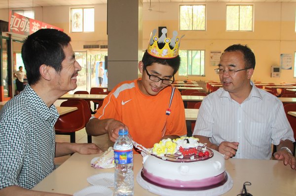 22日,是李云龙19岁生日,学院为期准备了生日蛋糕,图为学院院长、党委书记夏季亭和他们共度生日