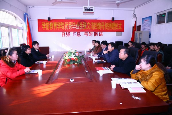 2013年12月12日济南剑桥外国语培训学校董事长,我校05届优秀毕业生张文清女士向我学前教育学院捐赠价值5万元的中国知网服务卡,分五年捐赠。此次捐赠仪式在我校就业处举行。学校分管就业院长刘存刚博士,学前教育学院院长陈文华教授,学前教育学院就业副院长于森林,学前教育学院教学副院长刘艳珍,学前教育学院行政副院长郑雯等领导出席仪式并发表讲话。