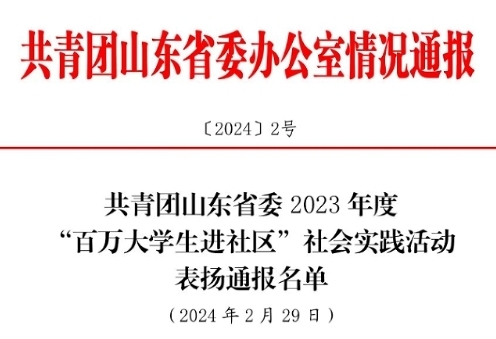 近日,共青团山东省委发布的《共青团山东省委2023年度“百万大学生进社区”社会实践活动表扬通报名单》,对“百万大学生进社区”社会实践中表现优秀的集体和个人进行通报表扬,山东英才学院荣获多项荣誉。