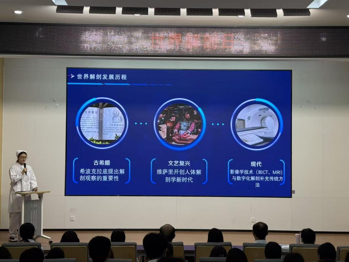 10时10分,师生移步报告厅。本科护理学2403班魏睦欣同学作题为《探索生命奥秘,拥抱健康未来》的主题报告。报告以3分钟动画短片串联起解剖学先驱维萨里、进化论学者达尔文以及现代数字人技术的发展历程,现场三次响起热烈掌声。报告强调:“解剖学不仅是技术,更是人文——每一把手术刀背后都站着一位老师。”