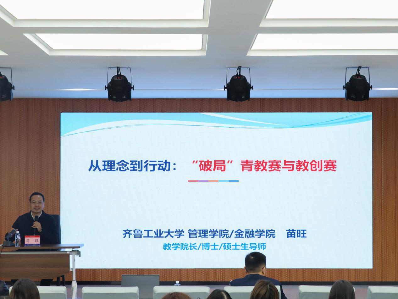 为深化教学改革,精准助力教师备战青年教师教学比赛与教师教学创新大赛,系统提升教师教学设计与课堂展示能力,商学院(国际学院)于2025年10月17日特邀齐鲁工业大学管理学院/金融学院教学院长苗旺教授,举办了题为《从理念到行动:破局青教赛与教创赛》的专题讲座。商学院全体教师参加培训。