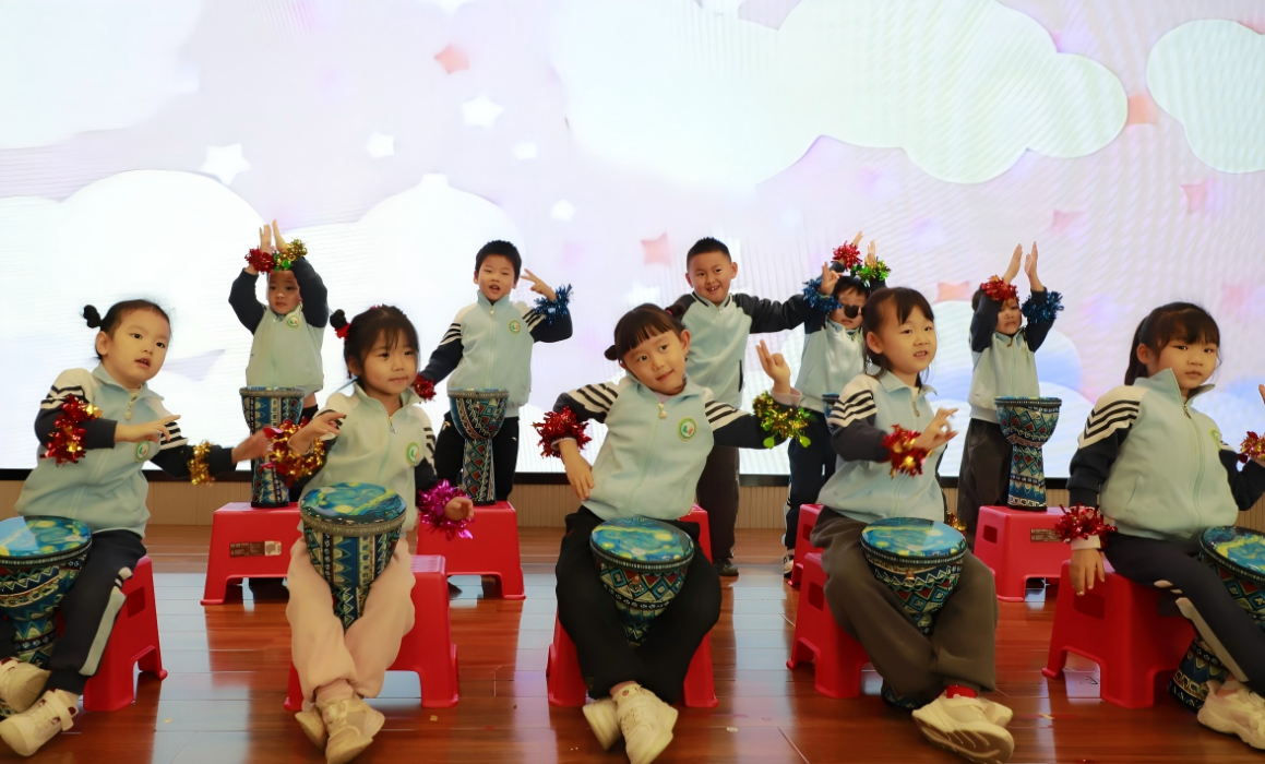 随后,山东英才学院学生带来的互动式儿童剧《小红帽的森林冒险》赢得了满场欢腾。演出打破传统观演边界,孩子们通过举牌指路、齐声提醒、节奏互动等方式成为剧情推动者。现场目光灼灼、小手林立,惊呼与欢笑交织,艺术在这里不再是观赏,而是可参与、可改变的游戏。幼儿园大班舞蹈社团则献上民族风舞蹈《欢庆鼓娃》,鼓点铿锵、舞步飒爽,童真与热情燃动全场,展现出幼儿艺术素养的扎实积淀。