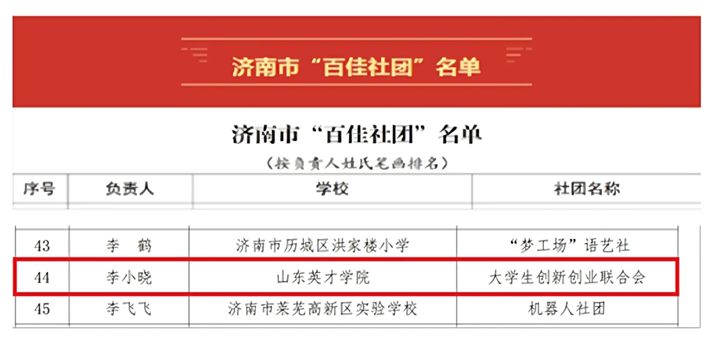 近日,济南市教育局公布2025年济南市“百佳社团”名单,山东英才学院大学生创新创业联合会凭借特色鲜明的品牌活动与扎实丰硕的育人成效从众多参选社团中脱颖而出,成功入选。