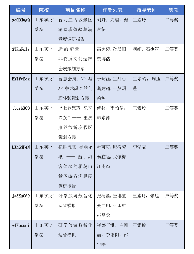 其中,由刘丹、刘璐、戴永征同学组成的团队,在王素玲老师的悉心指导下完成的《台儿庄古城景区消费者体验与满意度调研报告》,以全面系统的调研数据、深入浅出的问题剖析及切实可行的优化方案,从众多参赛作品中脱颖而出,荣获本科组国家级二等奖。此外,另有6个参赛项目凭借鲜明的创新特色、清晰的逻辑架构斩获国家级三等奖。值得关注的是,张淯淞团队与崔盛子淇团队精准聚焦研学旅游行业数智化转型需求,构建高效运营模式,为行业高质量发展提供了新思路、新路径。