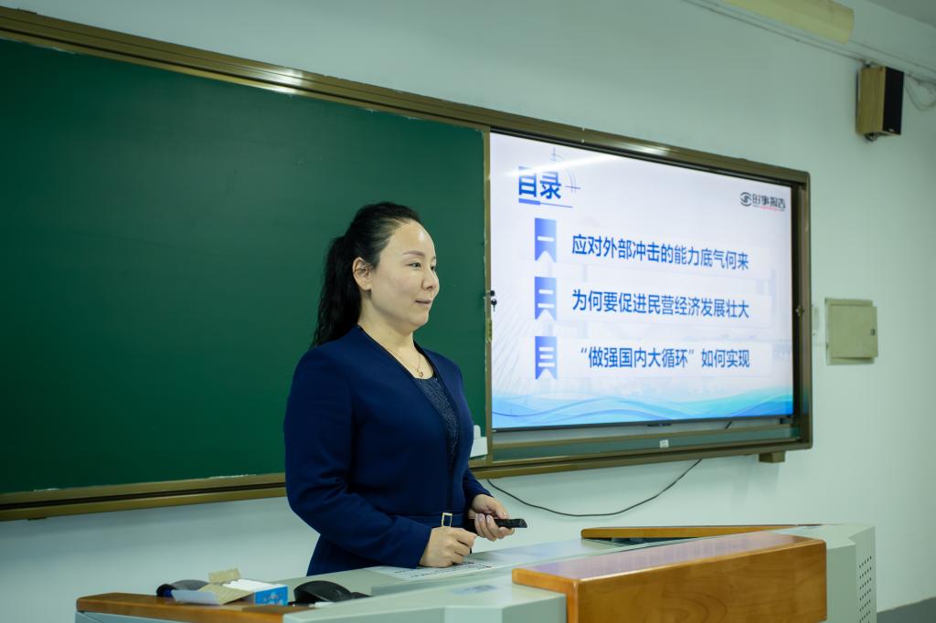 纪委书记、副校长李晓玲以《正确认识中国经济热点问题》为题,剖析了中国经济发展的基本面与新特征,帮助同学们准确理解中国经济发展的深层逻辑。李晓玲还在课堂上与同学们展开热烈讨论,教导同学们要努力学好专业知识,不断提高自身素质能力,主动融入社会大课堂,为中国经济高质量发展注入自己的青春智慧。