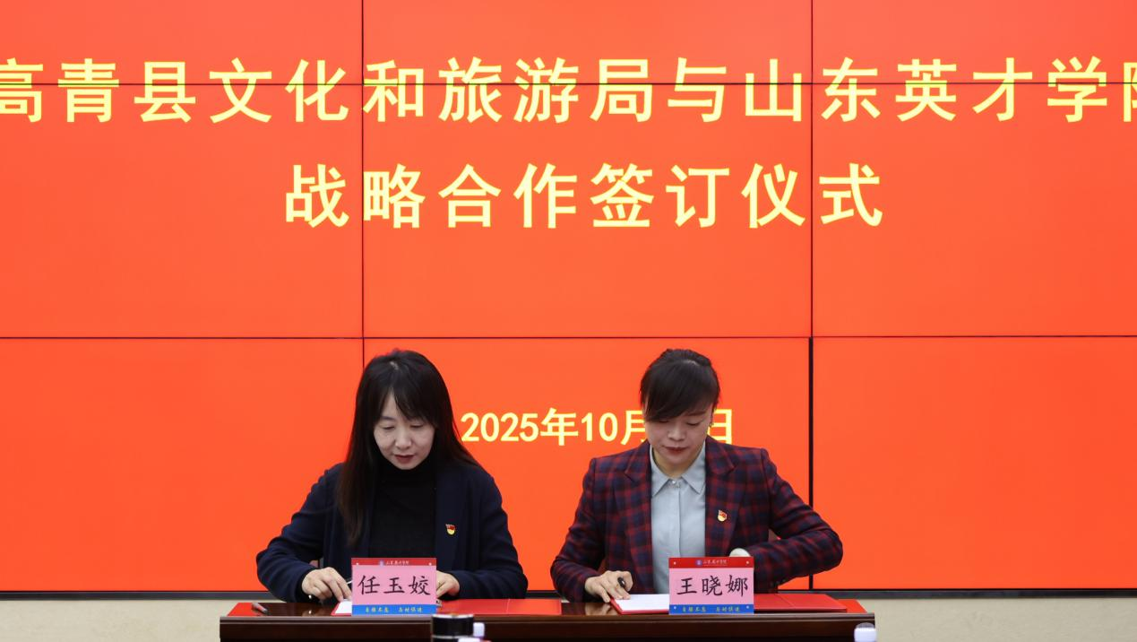2025年10月23日上午,山东英才学院与高青县文化和旅游局战略合作签订仪式暨支部共建活动在学校南校区隆重举行。高青县文旅局党组书记、局长任玉姣,党组成员、文物事业综合服务中心主任李建波,党组成员、副局长王强、唐荣奇及局属相关部门党员干部;山东英才学院党委副书记、执行校长王晓娜,党委委员、副校长崔奎勇,马克思主义学院院长李强,设计学院院长郝莹,设计学院副院长尚宪福,马克思主义学院副院长武玉兴,商学院专业负责人魏书锋等共同出席活动。