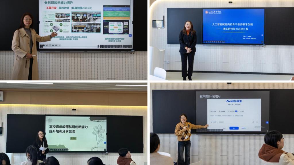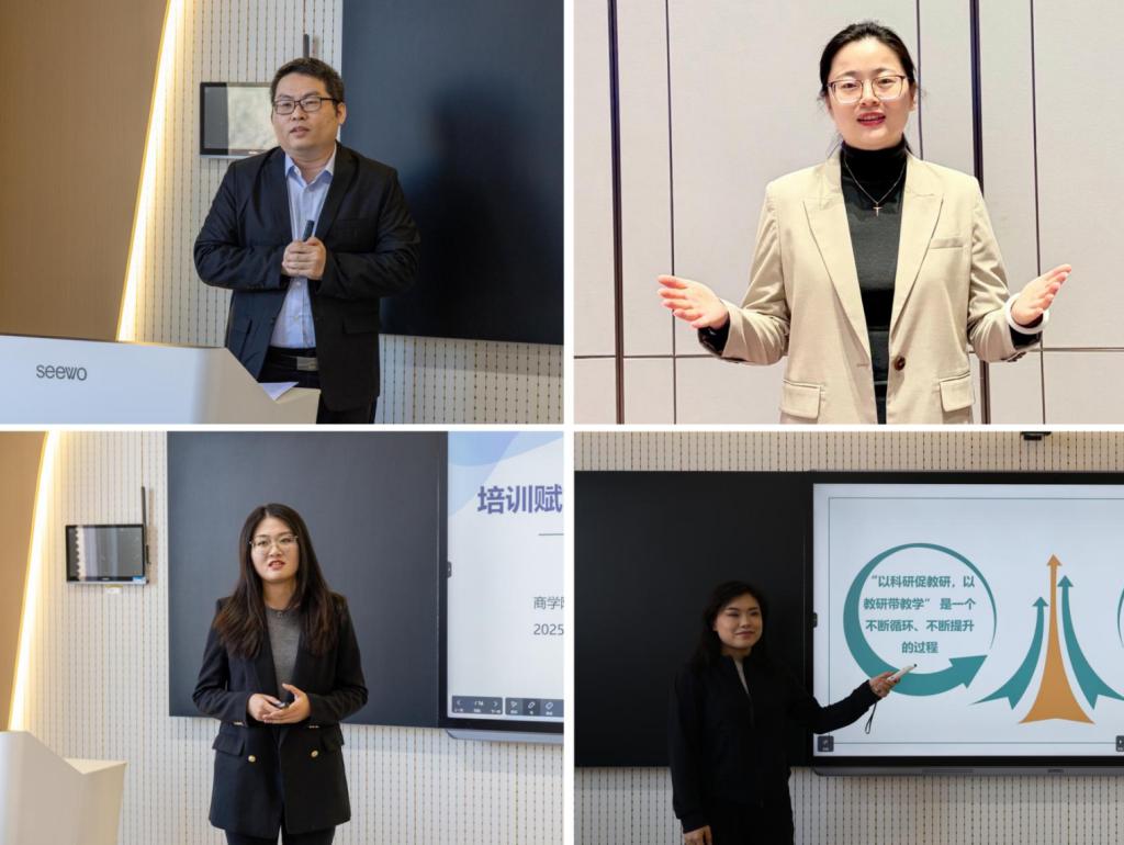 在分享环节中,八位参训教师代表依次登台,围绕师德师风建设、教学创新、科研能力提升、人工智能赋能等前沿议题,以十分钟凝练而深入的讲述,生动展现了他们在国内一流高校的所学所感、所思所悟。通识教育学院张彪老师紧扣“立德树人”根本任务,深情讲述了新时代加强师德修养的实践路径与价值追求。学前教育学院杨春凤老师分享了从教育理念革新、AIGC技术赋能到课程思政融合、项目制教学实践等多维度的教学创新前沿动态。商学院(国际学院)马艺凡老师和音乐舞蹈学院刘婧老师,系统介绍了如何有效运用BOPPPS模型优化课堂教学设计,并以开阔的国际视野、智能化的技术工具、教研相长的实践路径,阐述了教学能力迭代升级的思考与探索。医学院王秀丽老师与音乐舞蹈学院陈梦姣老师则分别从理工医融合创新与人文艺术学科视角,交流了科研选题、方法创新与成果转化的心得。商学院(国际学院)徐宝凤老师与工学院李珊珊老师聚焦智能技术与教育的深度融合,展望了智慧教育赋能个性化学习与教学改革的广阔前景。