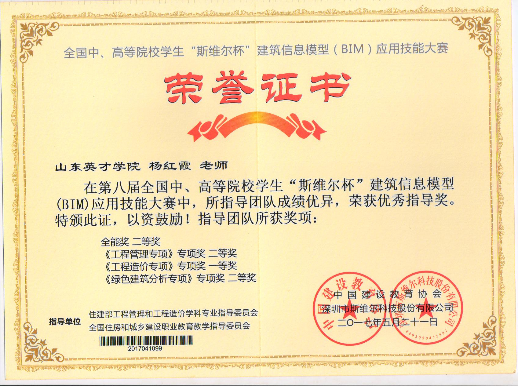 全国中高等院校斯维尔杯(第八届)BIM应用技能大赛建筑工程学院杨红霞老师获奖证书