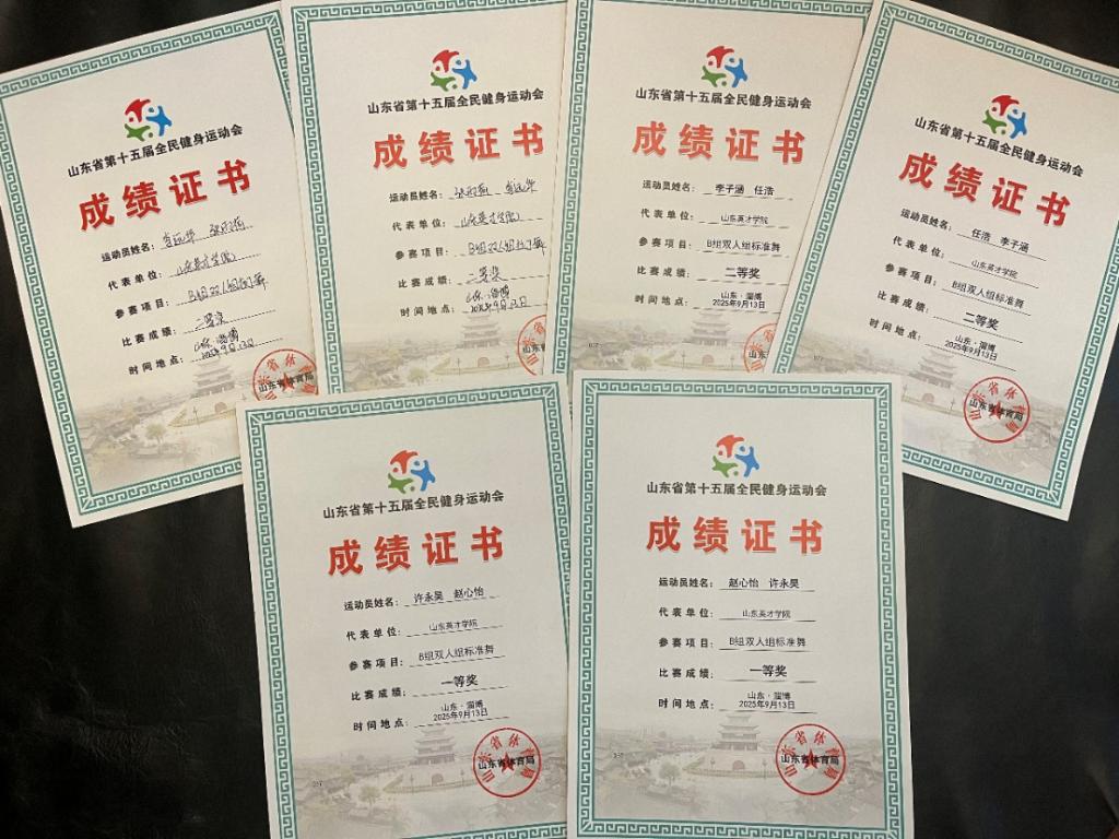 2025年9月13日,山东省第十五届全民健身运动会国标舞项目比赛在山东省淄博市圆满落下帷幕。山东英才学院国标舞校队派出三组队员参赛,队员们凭借着扎实深厚的专业功底、天衣无缝的默契配合以及极具感染力的出色舞台表现力,在众多实力强劲的参赛队伍中脱颖而出,获得了B组双人标准舞一等奖、二等奖以及B组双人拉丁舞二等奖的好成绩,展现出了英才学子出类拔萃的艺术素养以及顽强拼搏的竞技精神。