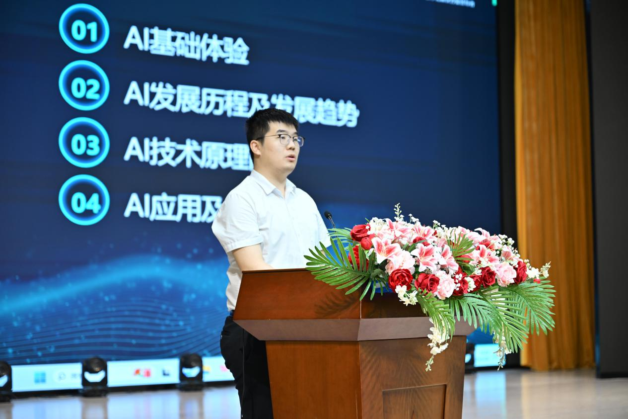 问卷调查结束后,孙嘉伟老师登台分享。他从人工智能技术的发展历程讲起,沿着技术演进脉络,逐步深入到AI大模型的工作原理,并结合教育、医疗、商业等领域的典型应用场景,进行了深入浅出的讲解。生动的案例与直观的展示,让师生们切实感受到AI大模型的强大魅力与无限潜力,极大激发了大家探索人工智能领域的热情。