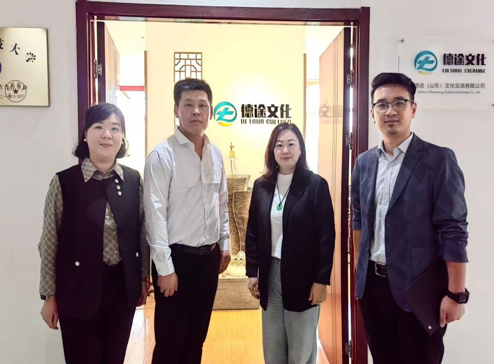 在德途(山东)文化交流有限公司,企业负责人热情接待了访企团队,带领参观了文化展示区与项目运营中心,并详细介绍了企业发展规模、业务领域及行业布局。作为专注文化传播领域的企业,其在艺术交流、文创研发等板块的布局与设计学院专业高度契合。座谈中,负责人强调校企合作对企业人才储备与高校实践教学的双重价值,希望能吸纳具备创新思维的设计人才参与文创项目。设计学院郝院长介绍了学院专业设置、人才培养特色及毕业生优势,双方围绕实习基地建设、文创产品联合研发、企业导师进校园等合作方向达成初步共识,计划为视觉传达、产品设计专业学子开辟定制化实践通道。