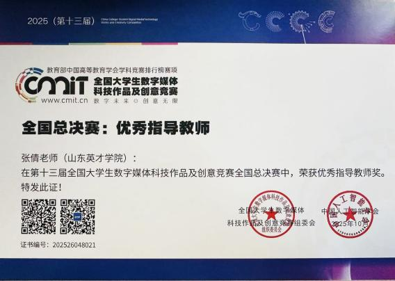 在本次竞赛中,山东英才学院设计学院,环境设计专业、视觉传达专业、产品设计专业、等多个专业方向的学生团队和个人,围绕文化传承、城市更新、IP设计、空间营造等主题,提交了丰富多样的数字媒体与科技作品,经过激烈角逐,共评选出国家级一等奖1项、国家级三等奖7项,省级一等奖1项、省级二等奖7项、省级三等奖6项。