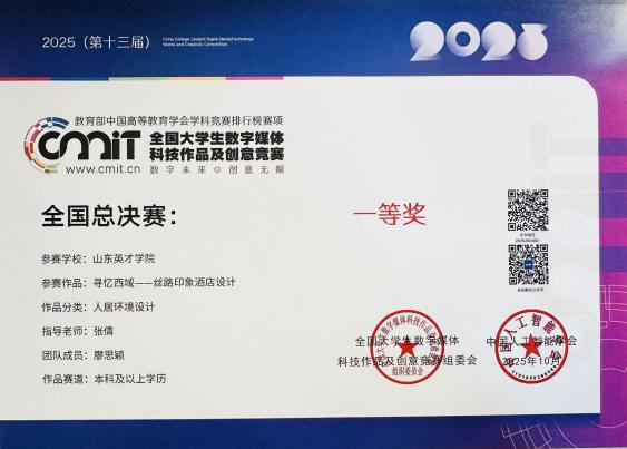 其中环境设计专业张倩老师指导的学生廖思颖凭借作品《寻忆西域——丝路印象酒店设计》荣获国家级一等奖。这一佳绩充分展现了我院在“艺术+科技”融合育人方面的扎实成效。