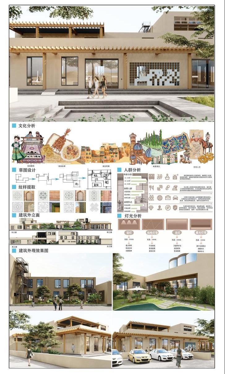 作品说明:本设计研究以北庭都护府遗址为文化基点,以丝绸之路文化体验为核心主题,探索文化遗产在当代酒店空间中的创新实践的方法。基于文化地理学与场所记忆理论,运用田野调查与符号学转译方法,系统解构北庭都护府遗址的空间特征,维吾尔与哈萨克民族的建筑形制、装饰艺术及节庆习俗,将当地特色文化融入酒店空间设计之中。设计方案通过现代建构技术再现历史场所精神,将非遗工坊、民族食肆、节庆剧场等多元功能分区整合,构建新兴的文旅综合体。空间规划采用"阿以旺"布局呼应传统民居格局,材料选择上融合生土建构,装饰系统中加入艾德莱斯纹样演绎装置,形成传统与现代的融合交流。项目创新性地提出通过住宿、餐饮、游览、研学四大功能模块的联动,实现文化静态保护向活态传承的转换案例。