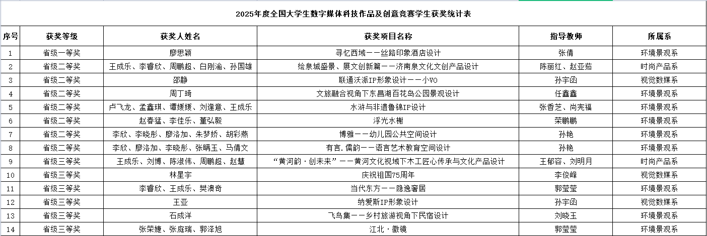 此次竞赛成绩的取得,是山东英才学院持续推进“以赛促教、以赛促学”教学理念的生动体现,也反映了学校在数字媒体、环境设计、产品创意等领域的教学实力与人才培养质量。未来,学校将继续鼓励学生参与高水平学科竞赛,激发创新潜能,培养更多具有实践能力与创新精神的高素质应用型人才。