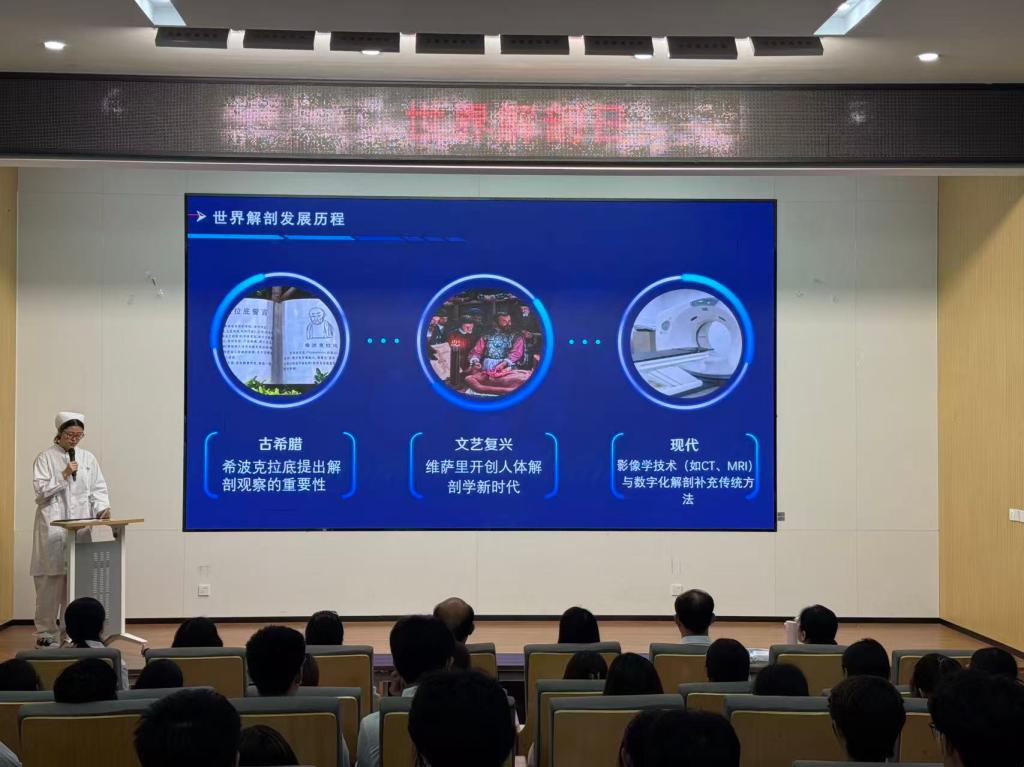 10:10,移步学术报告厅。中心学生骨干王旭主持,魏睦欣同学作《探索生命奥秘,拥抱健康未来》主题报告,3分钟动画串联维萨里—数字人技术,现场3次自发掌声。报告指出:“解剖学不仅是技术,更是人文——每一把手术刀背后都站着一位老师。”