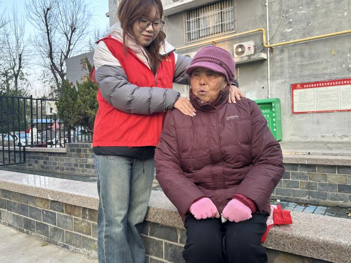 大学生志愿者在询问社区老人征得同意后,提起老人手中的重物,与老人轻声聊天,为老人解决生活上的麻烦。