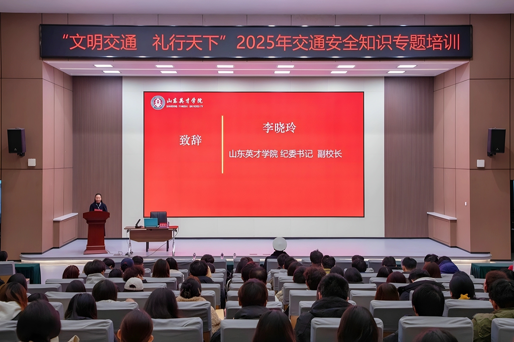 为切实加强校园交通安全教育,提升师生安全出行意识,12月16日,山东英才学院联合济南高新区交警大队孙村二中队,在学校学术报告厅成功举办“文明交通 礼行天下”交通安全知识专题培训活动。学校纪委书记、副校长李晓玲出席并致辞,高新区交警二中队翟羽佳队长担任主讲,安全管理处处长朱良增主持活动,全校300余名师生代表及通勤车司机共同参与。