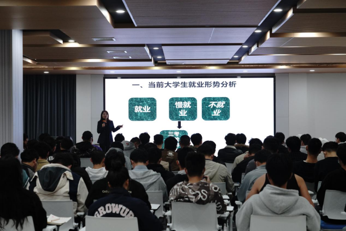 穆引妮老师联系自身经历,就当前大学生就业形势严峻、大学生慢就业、懒就业、如何破解大学生就业难题、理工科类大学生就业趋势、怎样做好职业规划等多个方面进行阐述,向我院毕业生讲述了职业规划对个人发展的重要性,多次强调拉动经济的“三驾马车”,通过当下热门事例和自身实际,精彩讲述了当前就业形式和面对就业难问题的解决方法,让同学们对就业问题有了更深刻的认识,使同学们对怎样明确自身职业目标、择业原则和对怎样破解严峻就业形势有了新的认知。