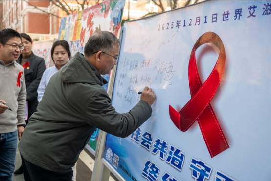 活动伊始,报告厅外布置了由学生志愿者手绘的防艾展板、手抄报。志愿者代表为参会领导及师生讲解我校防艾成果。互动签名墙前人头攒动。领导嘉宾郑重签下姓名、佩戴红丝带,表达对防艾事业的坚定支持,现场氛围庄重而温馨。