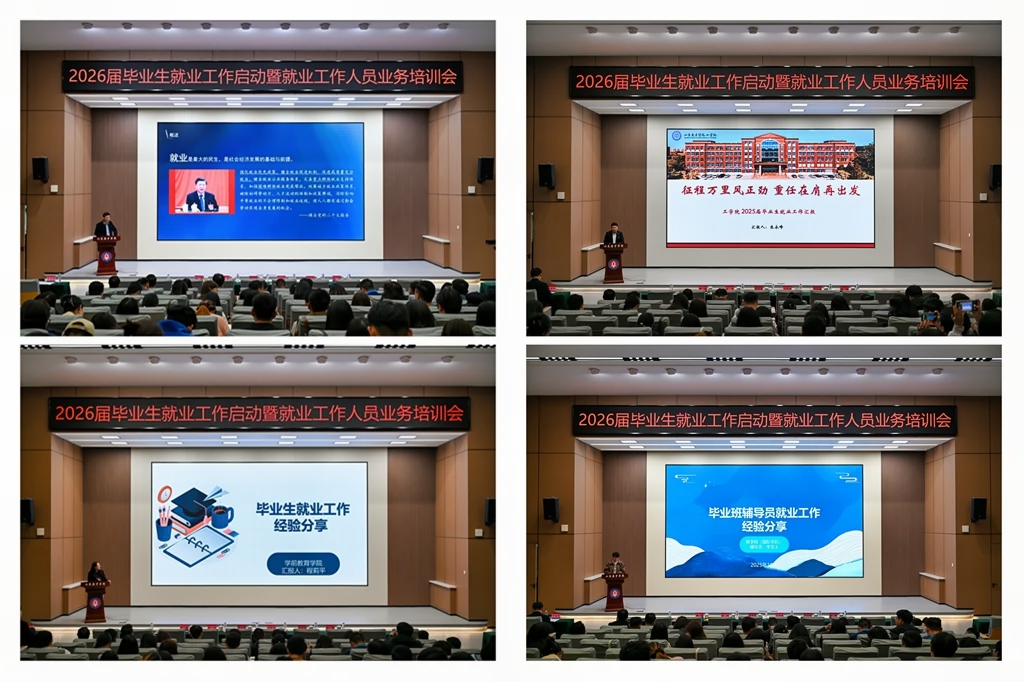 2025年10月30日,山东英才学院在南校区学术报告厅隆重召开2026届毕业生就业工作启动暨就业工作人员业务培训会。会议以“奋楫笃行 启航新程”为主题,全面总结2025届毕业生就业工作,系统部署新一届毕业生就业工作重点,并正式启动第三届大学生职业规划大赛。学校执行校长、党委副书记王晓娜出席会议并讲话,招生就业处、各二级学院负责人、就业工作领导小组成员及全体辅导员参加会议。