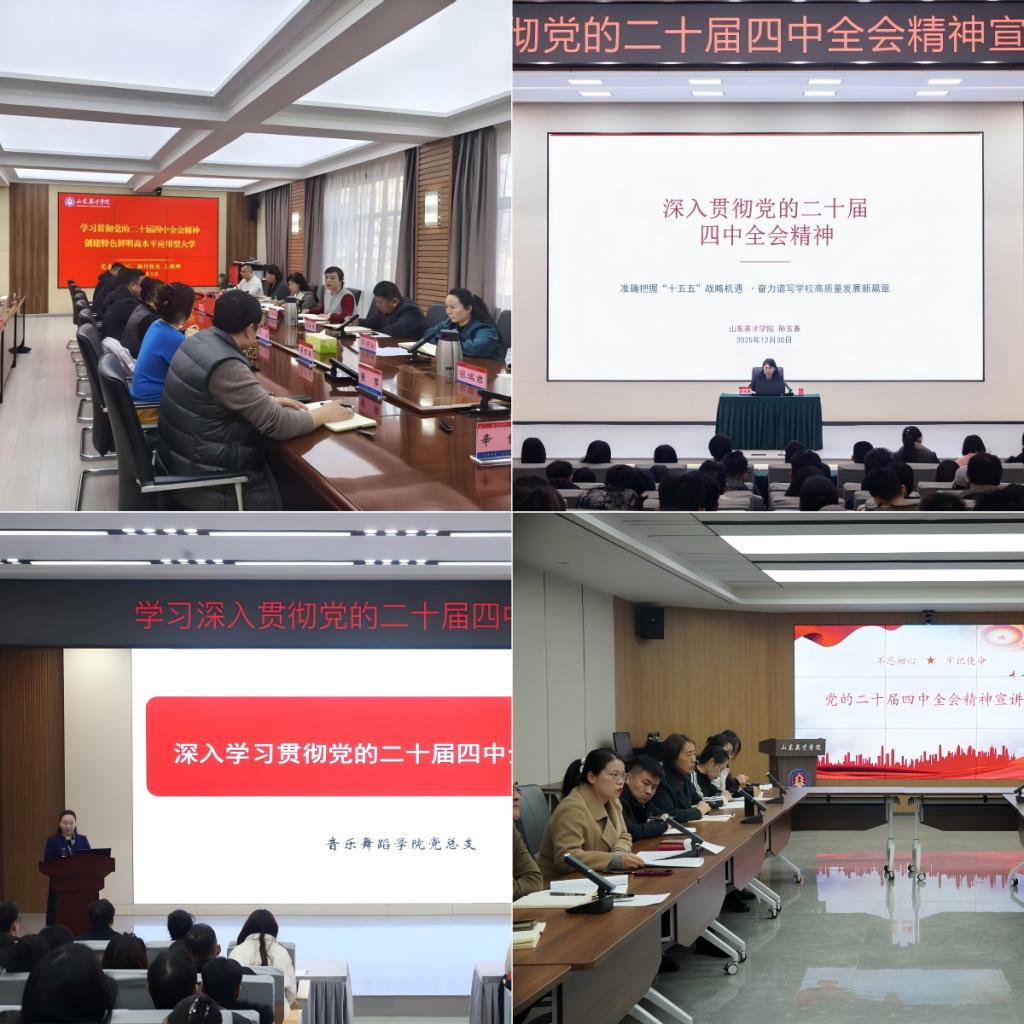 党委副书记、执行校长王晓娜立足学校发展现状,紧扣全会精神要义及实践指向,为全体中层及以上干部作专题宣讲。党委副书记、工会主席孙玉香聚焦党的二十届四中全会精神,面向师生代表开展集中宣讲。学校纪委书记、副校长李晓玲聚焦音乐舞蹈专业特色,面向学院师生开展集中宣讲。校长助理、学生工作处处长、团委书记张瑞君围绕宣讲提纲,为全体团学干部作专题宣讲。其他党委委员分别结合分管领域工作,围绕全会精神开展宣讲,引导广大师生切实把思想和行动统一到党中央决策部署上来,凝聚起奋进学校高质量发展新征程的强大合力。