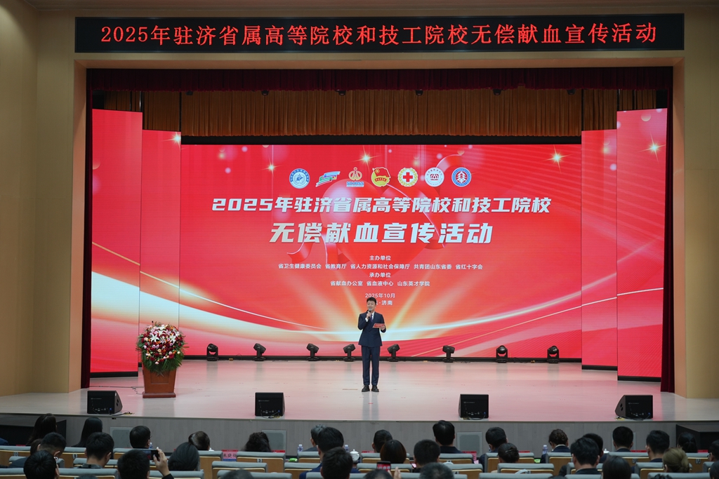为持续推进高校无偿献血工作,动员发动广大青年积极参与无偿献血志愿服务,2025年10月17日,驻济省属高等院校和技工院校无偿献血宣传活动在山东英才学院举行。省卫生健康委、省教育厅、省人力资源和社会保障厅、共青团山东省委、省红十字会等单位负责同志,驻济高等院校及技工院校有关工作负责同志、师生代表以及中国狮子联会等长期支持献血事业的志愿者代表共同参加活动。