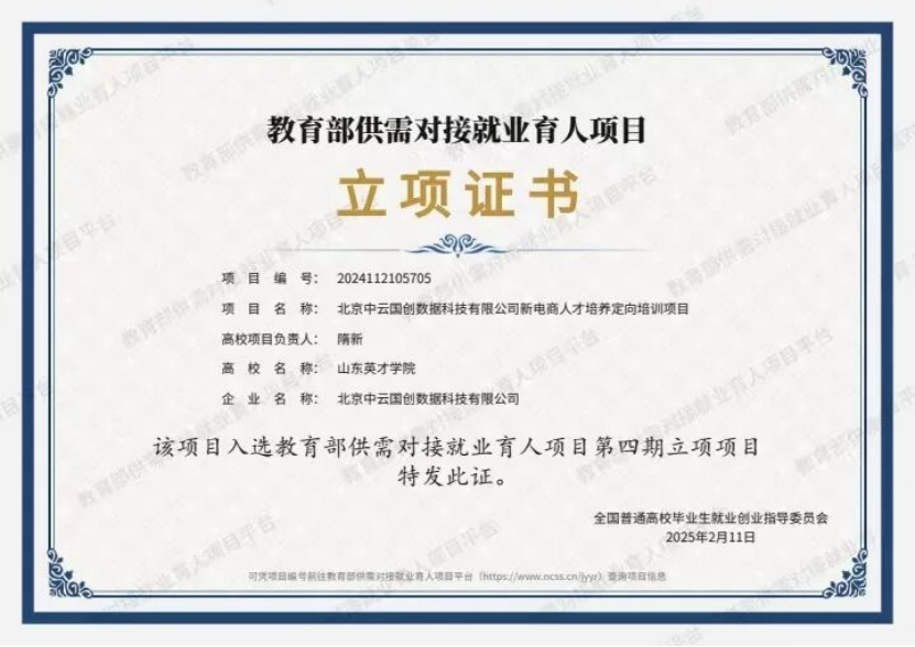 教育部供需对接就业育人项目平台第四期立项名单近日公布,山东英才学院商学院(国际学院)联合两家行业领军企业申报的《新电商人才培养定向培训项目》《新电商产业学院短视频与直播运营技能培训项目》双双获批,实现单年2项教育部该类项目立项的新突破。