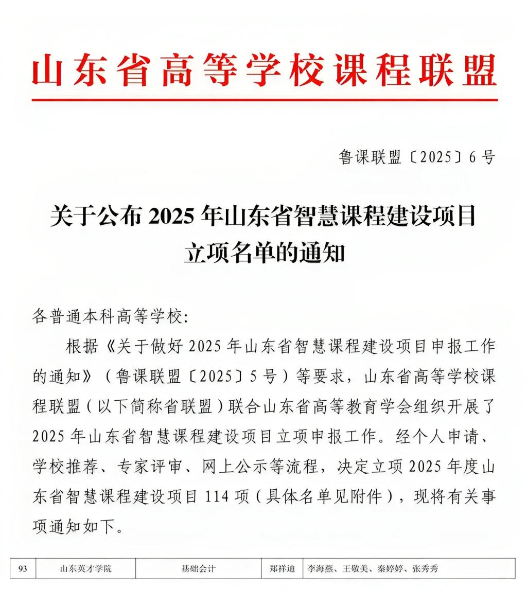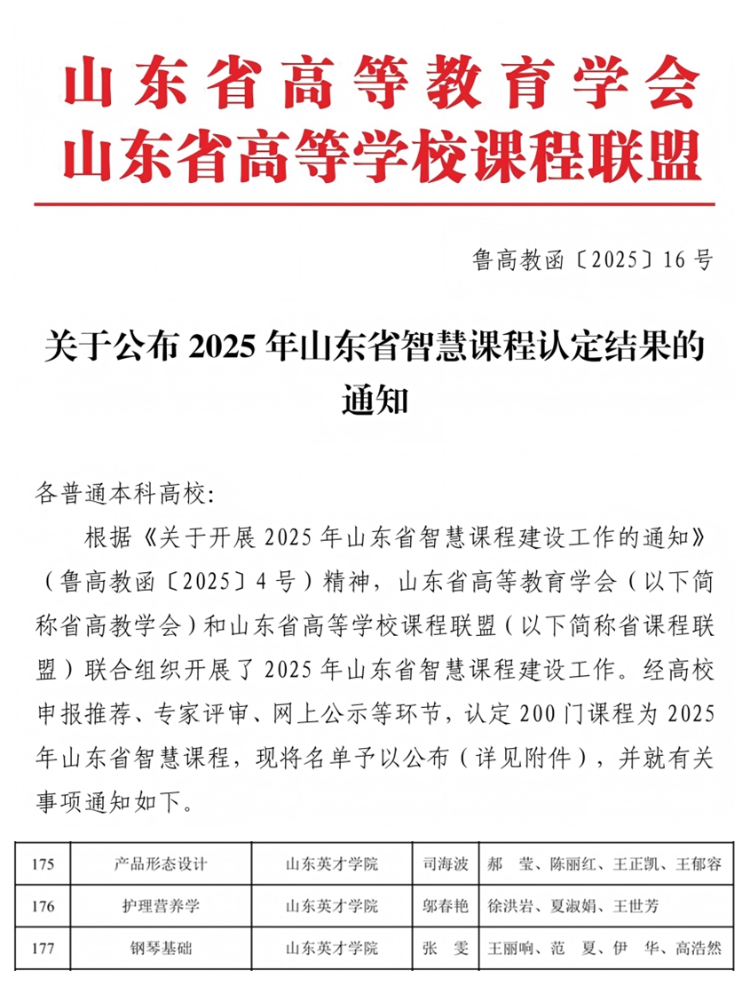 近日,山东省教育厅公布首批智慧课程认定结果,山东英才学院申报的4门课程全部入选,在课程认定与项目立项两方面均取得优异成绩。其中,司海波老师团队的《产品形态设计》、邬春艳老师团队的《护理营养学》以及张雯老师团队的《钢琴基础》3门课程获认定为省级智慧课程;郑祥迪老师团队的《基础会计》获批省级智慧课程建设项目立项。此次全部申报课程的成功入选,充分彰显了山东英才学院在课程建设方面的扎实基础与智慧化教学转型的显著成效。