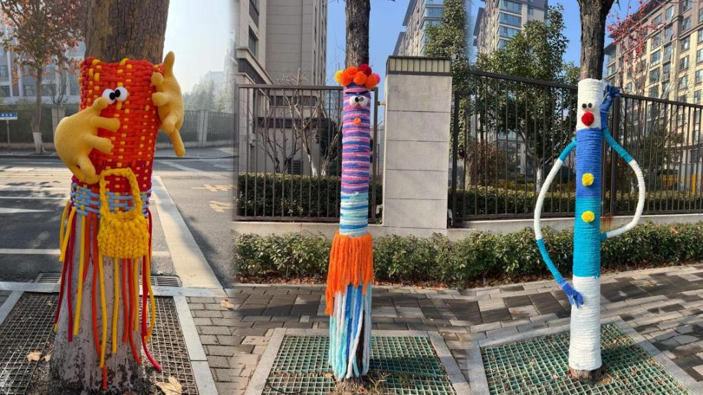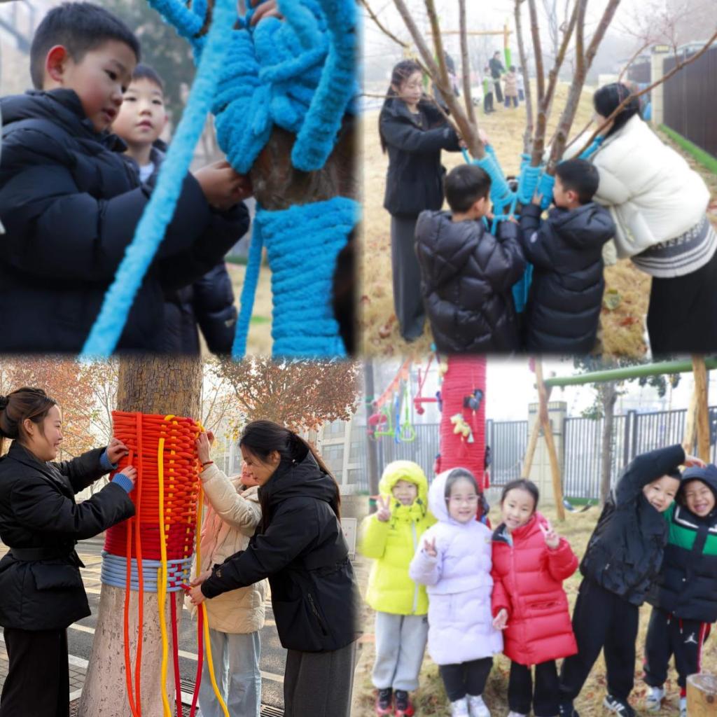 艺术实践环节将活动推向首个高潮。双方教师共同带领大二班幼儿开展户外艺术共创《树说童趣》。孩子们三五成群,利用布条、麻绳、松果、木片等低结构材料,为园内大树“穿”上童趣盎然的艺术外衣。缠绕、悬挂、装饰……每一个动作都专注而充满创意,一棵棵寻常树木顿时变身“童话森林的一员”。这一过程不仅是艺术创作,更是协作、探索与自然对话的生动课堂。