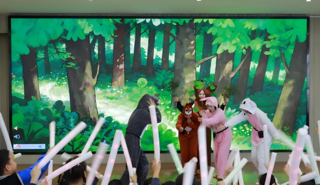 随后,山东英才学院学生带来的互动式儿童剧《小红帽的森林冒险》赢得了满场欢腾。演出打破传统观演边界,孩子们通过举牌指路、齐声提醒、节奏互动等方式成为剧情推动者。现场目光灼灼、小手林立,惊呼与欢笑交织,艺术在这里不再是观赏,而是可参与、可改变的游戏。幼儿园大班舞蹈社团则献上民族风舞蹈《欢庆鼓娃》,鼓点铿锵、舞步飒爽,童真与热情燃动全场,展现出幼儿艺术素养的扎实积淀。