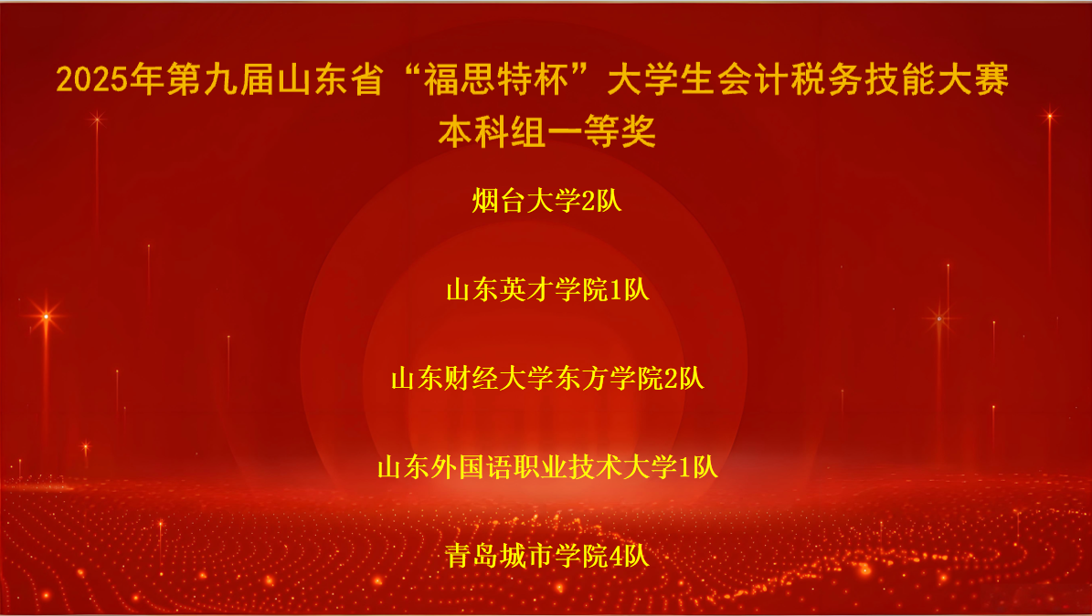 近日,第九届山东省“福思特杯”大学生会计税务技能大赛在线上成功举行。本次大赛由山东省教育厅高等教育处指导、山东省大学生会计税务技能大赛组委会主办,吸引了全省多所高校的优秀学子同台竞技。经过激烈角逐,山东英才学院商学院(国际学院)代表队在杜书英、郑祥迪、东野广甜三位教师的指导下,凭借出色发挥,荣获大赛一等奖,展现出我校学子突出的专业实力与协作精神。