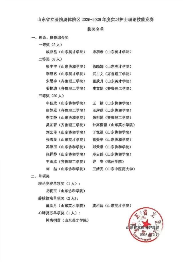 - 2026-02-05 捷报!山东英才学院学子在山东第一医科大学附属省立医院实习护士技能竞赛中斩获佳绩