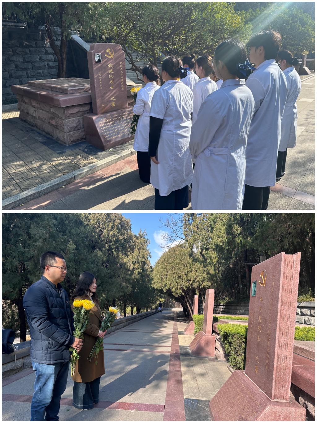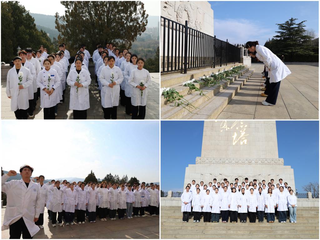 “行走的思政课”最后一站,设在庄严肃穆的济南革命烈士陵园。这里安葬着1900余名革命烈士,包括中共一大代表王尽美、邓恩铭等先驱,以及600余名待寻亲的无名英雄,每一座墓碑都是一个生动的思政教学载体。同学们以“志愿实践”深化学习成效,分工协作手持清洁工具,小心翼翼为烈士墓碑擦拭尘埃,轻柔而虔诚的动作中,是对英烈的敬畏与缅怀;洁白的护士服与墓碑前的鲜花相映成景,构成一堂无声却震撼的“职业思政课”。擦拭完毕后,学子们再次列队献花、鞠躬致敬,在庄严肃穆的氛围中,将先烈精神转化为“健康所系、性命相托”的责任担当。