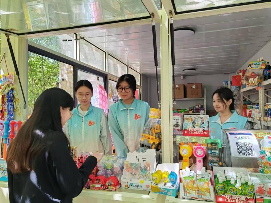 公园内商店人流较大,结账处排起长队。女大学生们主动帮忙,引导游客有序排队,协助店员扫码、装袋,加快结账速度,缓解商店运营压力,让购物秩序井然。