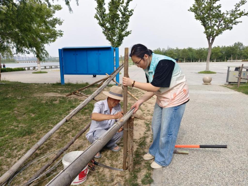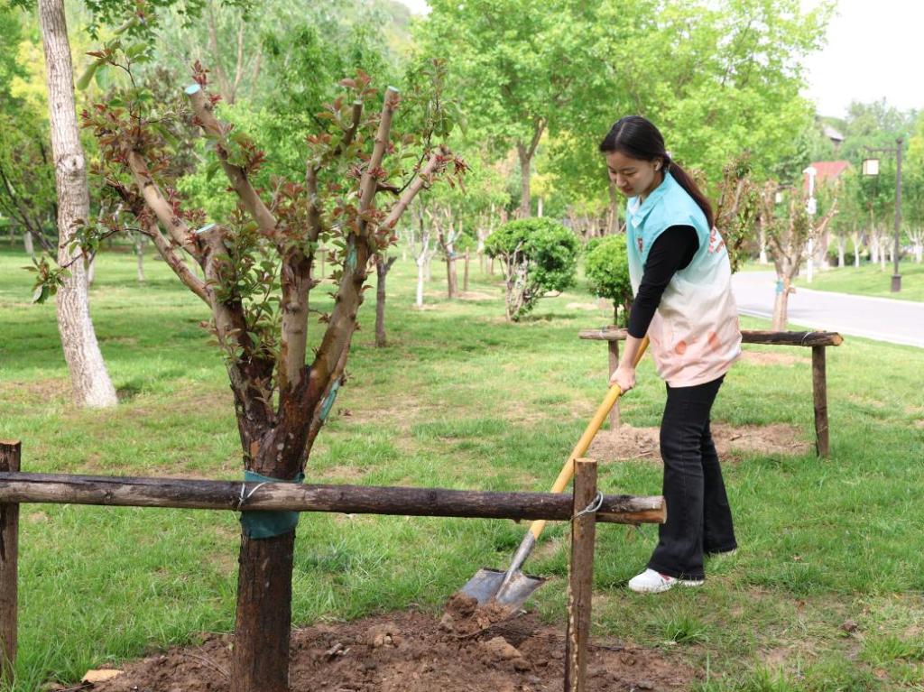 志愿者们深入景区,为植被松土。这不仅美化了景区环境,还展现了当代青年在生态保护中的积极作用和社会责任感。
