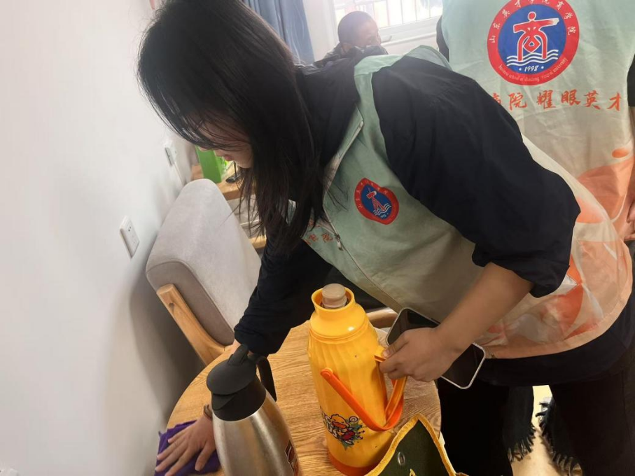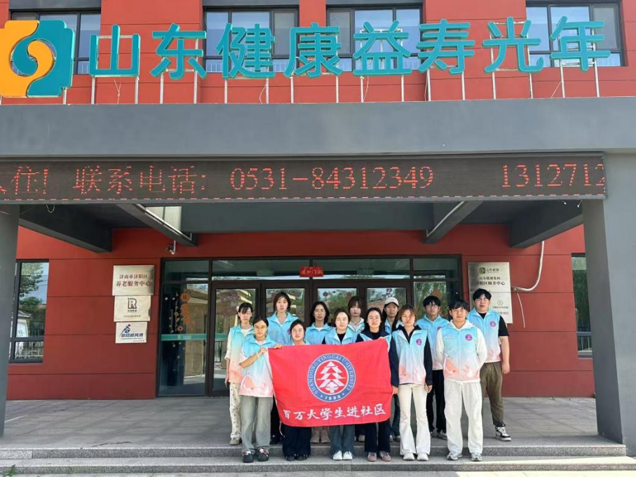2025年4月16日的早上,山东省济南市济阳区济阳街道山东健康益寿光年济阳区颐养中心来了一群青年人。山东英才学院商学院(国际学院)学生身穿志愿服务的马甲,带着青春的活力与热情来到这里,开展为期一天的百万大学生进社区的志愿活动。