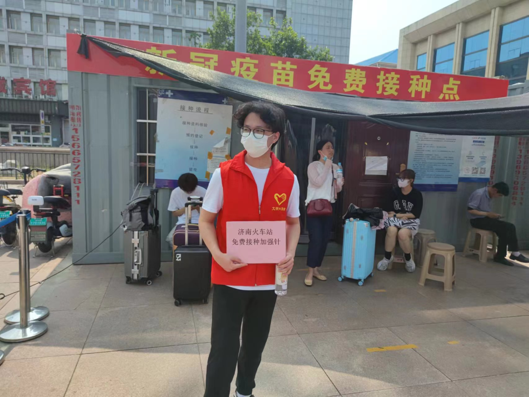 宣传接种、增强大众免疫——负责人带领实践团的队员们来到济南火车站,在40度高温下,实践团成员露天工作,顶着炎炎烈日,向来往人员宣传免费新冠疫苗加强针,对未进行接种的人员进行流程上的指引,在这过程中,社区工作人员对于实践团成员不怕苦、不怕累的精神表示赞赏,也对于他们耐心的工作态度表示肯定。