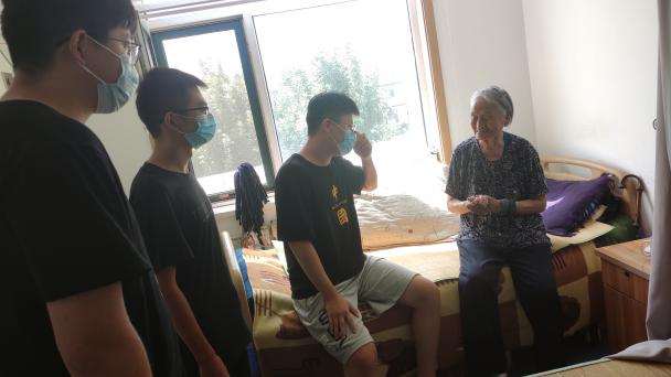 老人们和蔼可亲,与队员攀谈起来,他们讲述了一些自己的故事,也为队员们送上了祝福,队员们也对老人们送上带来的礼物。之后是老人们的午饭时间,在这个时间段里,队员们对养老院进行了打扫,其他队员也在食堂进行分配午饭的工作。