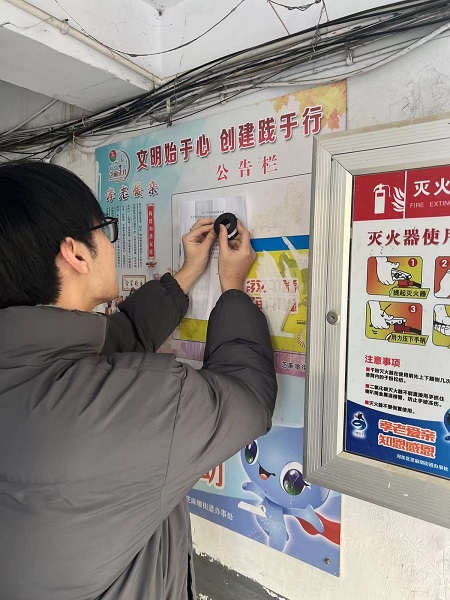 在社区工作人员的带领下,对小区地面上的垃圾、楼道散布的杂物与小广告、健身器材的脏乱等问题逐一清理。一路上捡拾垃圾,清理杂物,扫、装、倒一气呵成。搬运社区内的防疫物资,确保在病毒流传严重期间口罩,酒精等防疫物品的充足。同社区工作人员一起对谨防诈骗进行宣传。