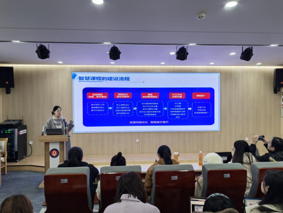 培训中,付忠英老师首先阐述了智慧课程的五大组成要件,即智慧化内容组织形式、智慧化教学过程、智慧化教学辅助工具、智慧化学习支持系统与智慧化教学分析评价,构建了完整的理论框架。随后,她聚焦于落地实践,详细梳理并演示了智慧课程的建设流程:从基础的在线课程资源与章节建设,到组织实施课程运行混合式教学;从深化内涵的课程知识图谱建设,到高效利用AI工作台任务引擎进行智能助教、个性化辅导等创新实践;最后延伸至成果固化与辐射的课程推广阶段。整个讲解逻辑清晰,层层递进,为青年教师描绘出一条清晰可行的智慧课程建设路径。