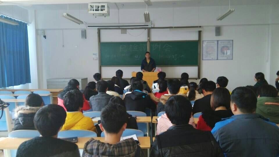 本次会议程东主席与部员们进行心与心的交流,同时指出在工作中存在的问题并让改正。身为纪检部的一员不止要有狼的精神,同时应该懂得纪检部也是一个纪律严明的部门。一个纪律严明的部门则是由多个纪律严明的部员组成的。这也是贾欢副主席在本次会议中表达的重点。魏文娟部长先进行上周工作总结。新闻稿、跟会、值班执勤、组织入场一律按以往的要求继续进行。除此之外,充实而又忙碌的一个月已敲响了战鼓,双旦晚会的组织入场,饺子宴、团课培训、趣味运动会都需要部员们打起十足的精神奋力作战。