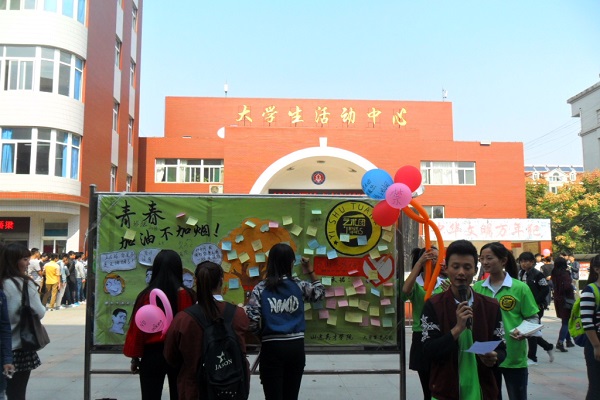 2015年10月14日,为贯彻落实《山东英才学院关于创建“无烟校园”的实施方案》,切实加强校园精神文明建设,营造卫生和谐的校园环境,青年志愿者协会和艺术团的同学们在大学生活动中心前举办了“无烟校园”倡议活动。